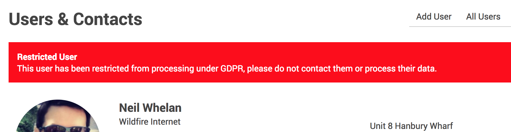 Under GDPR registered users can object to having their data processed. In REC+ this means restricting processing via Email Manager (so the user won't be included on emails) and in User Manager and Prospect Manager a red warning message is displayed when you select the user advising: