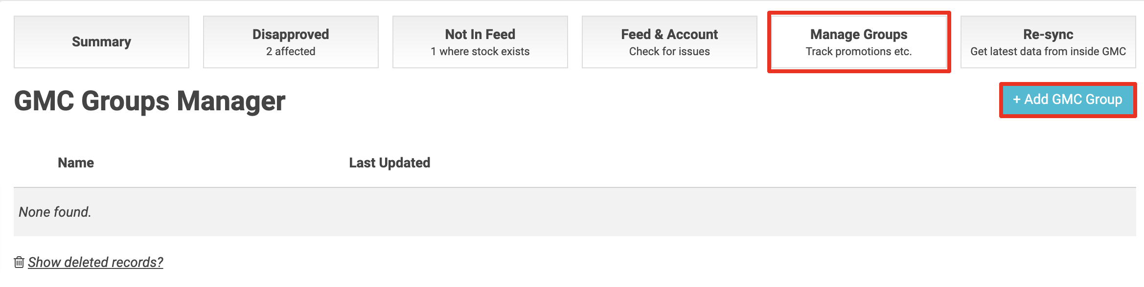 In GMC Summary click n Manage Groups then Add GMC Group and enter the details and Google product IDs.