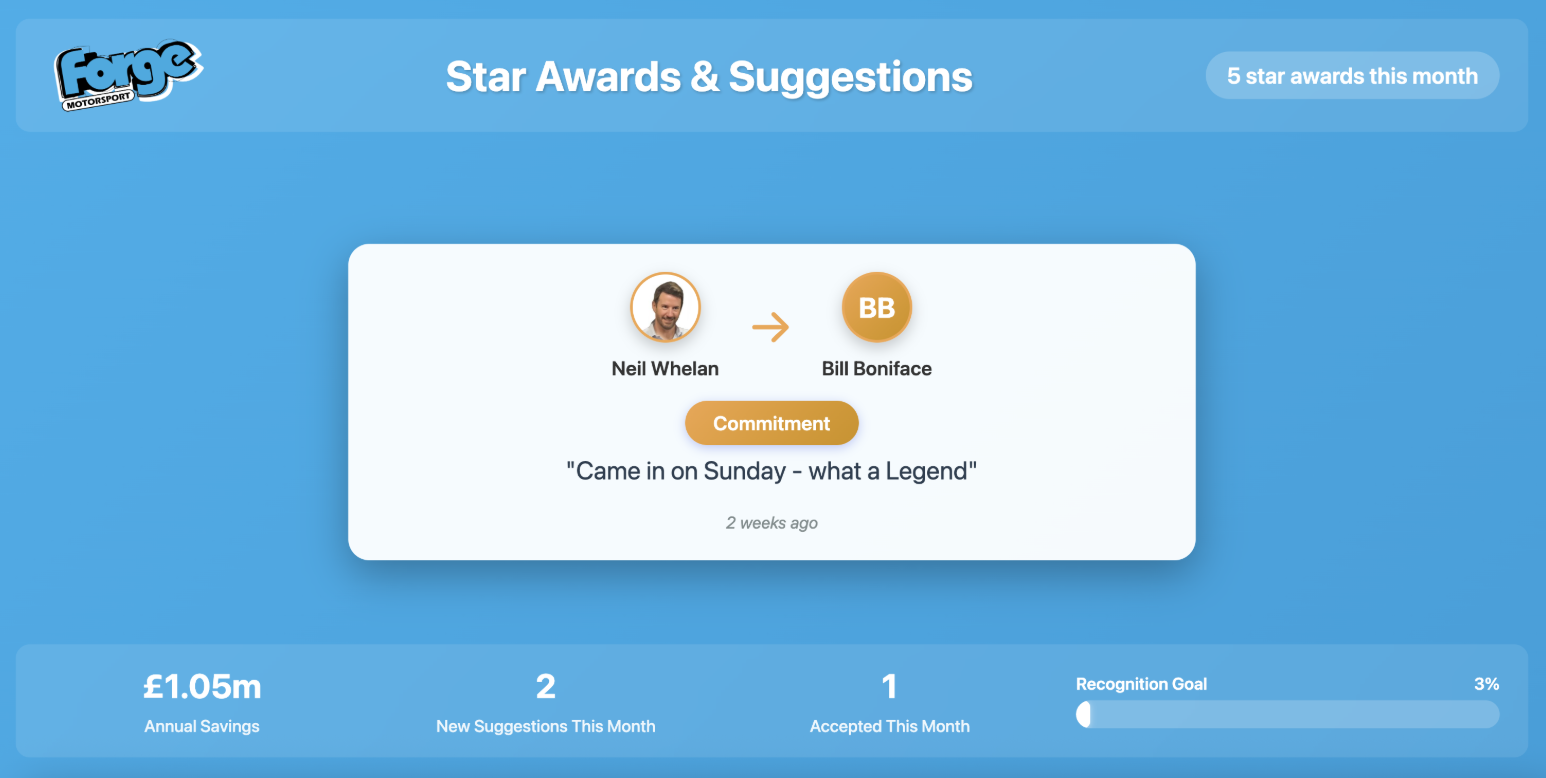 The "Display Wall" feature allows you to display Recognition & Suggestion data on large screens in your office so that there is public visibility which drives adoption and greater engagement.