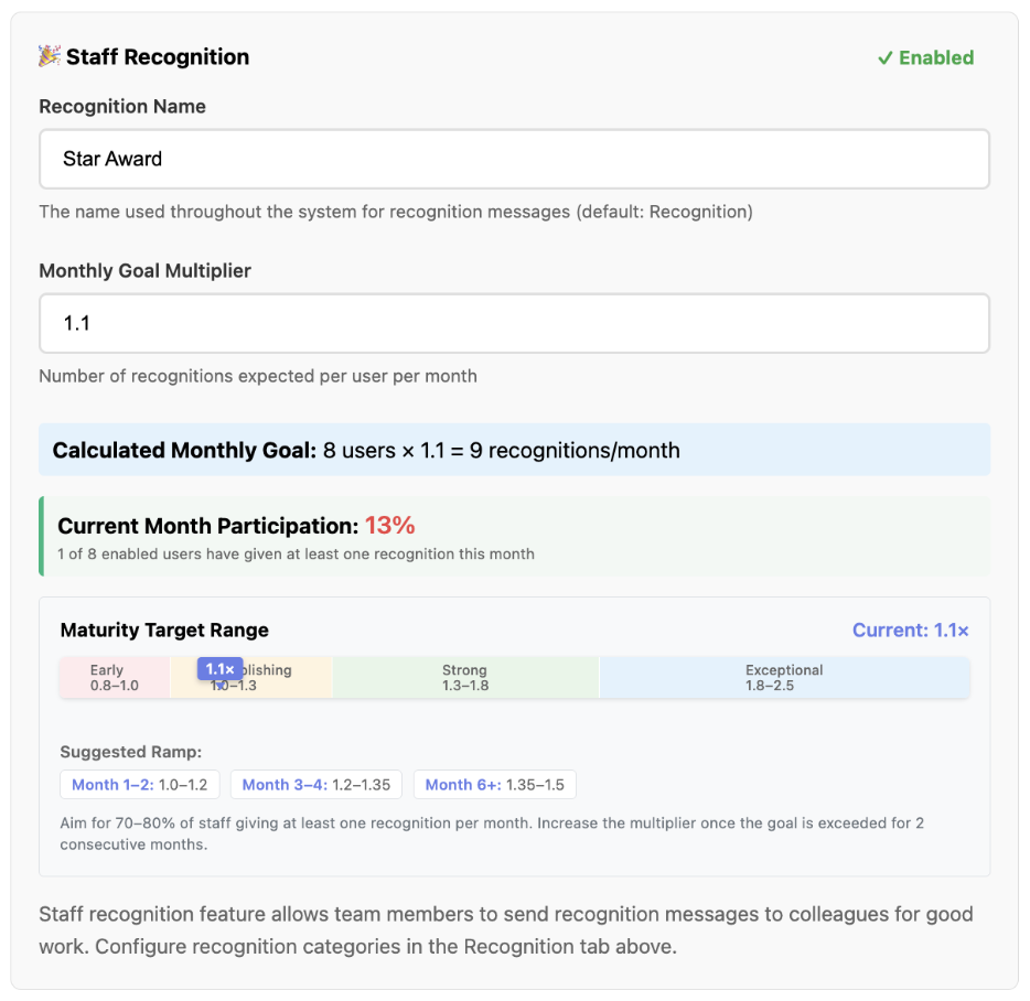 In the Admin Dashboard under Settings > Staff Recognition, you'll be able to set a Monthly Goal Multiplier which defaults to 1.2 but you can reduce this early in the cycle and push it upwards as time progresses and engagement builds. This gives a Calculated Monthly Goal of the number of recognitions you should expect to receive in a month. Set this to 0.8 - 1.0 in the initial launch stage.